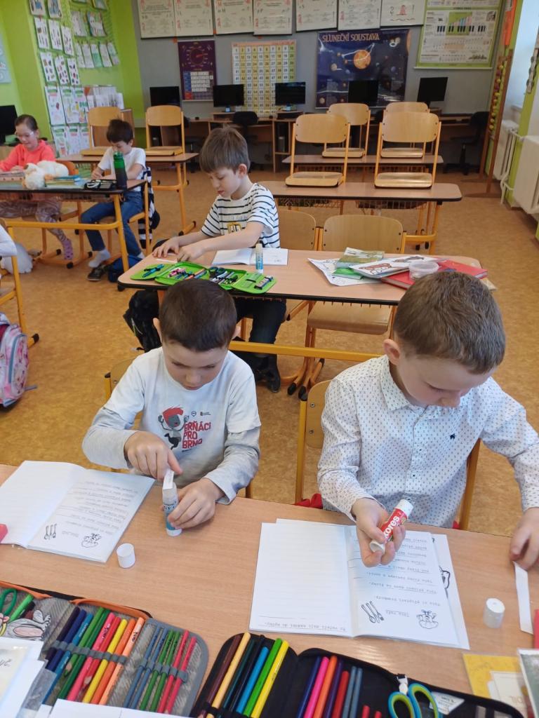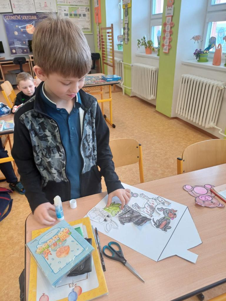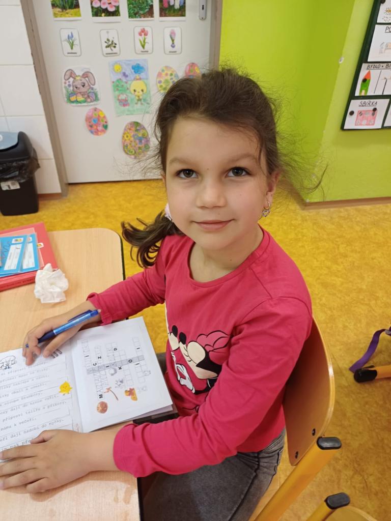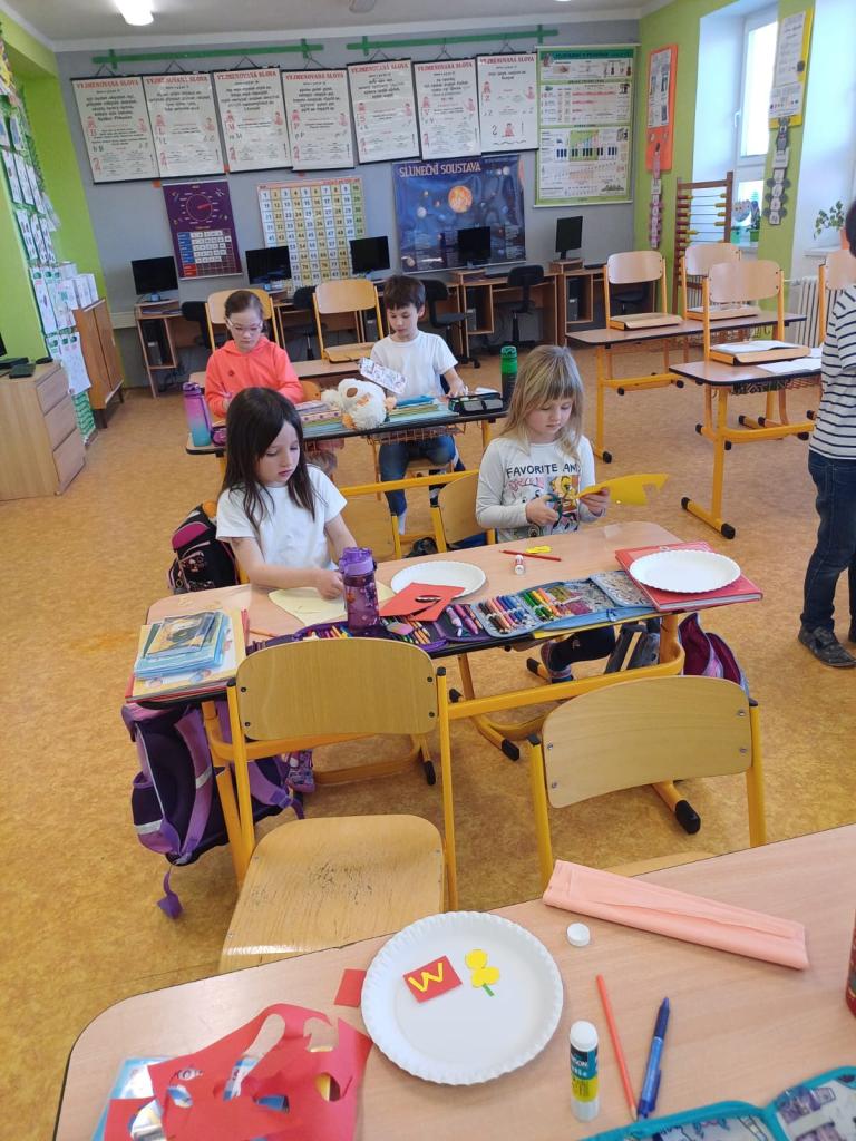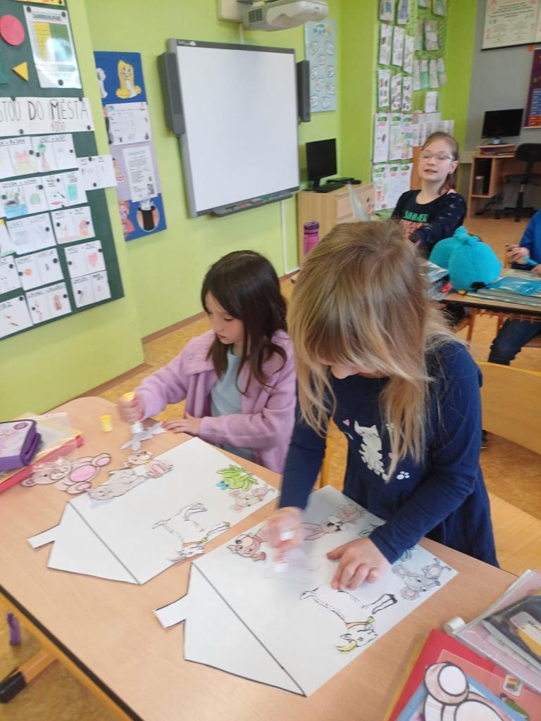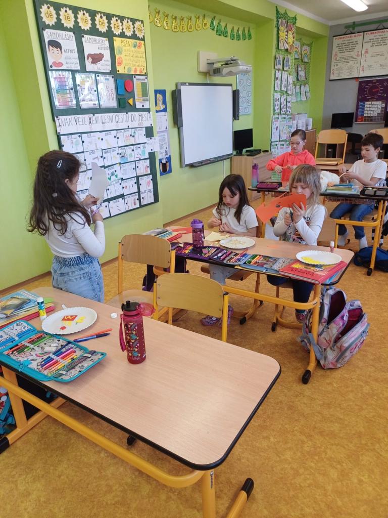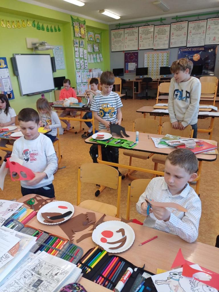 Prvňáci v hodinách čtení skládali osnovu příběhu, tvořili svoje oblíbené jídlo z papíru a pohádku O budce, také luštili velikonoční úkoly a vyzdobili velikonoční přání.