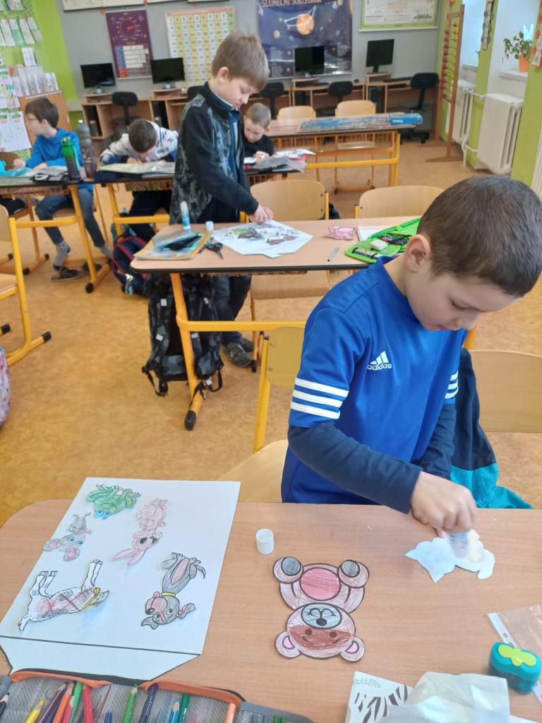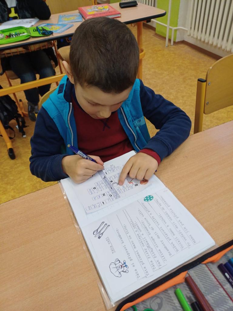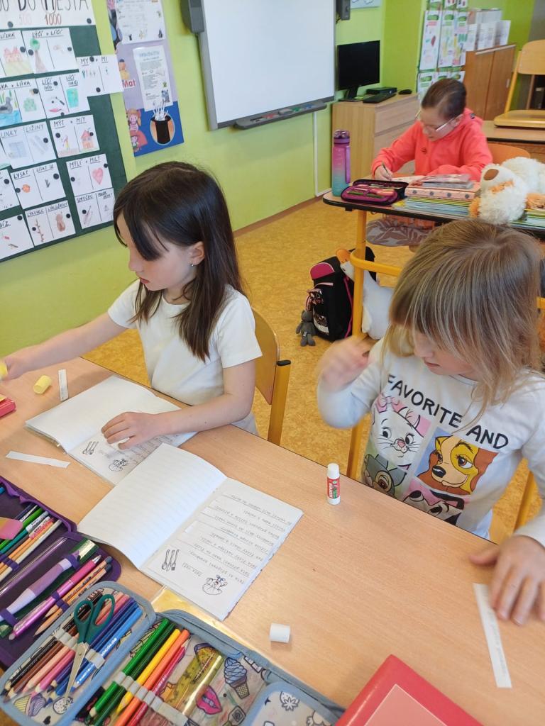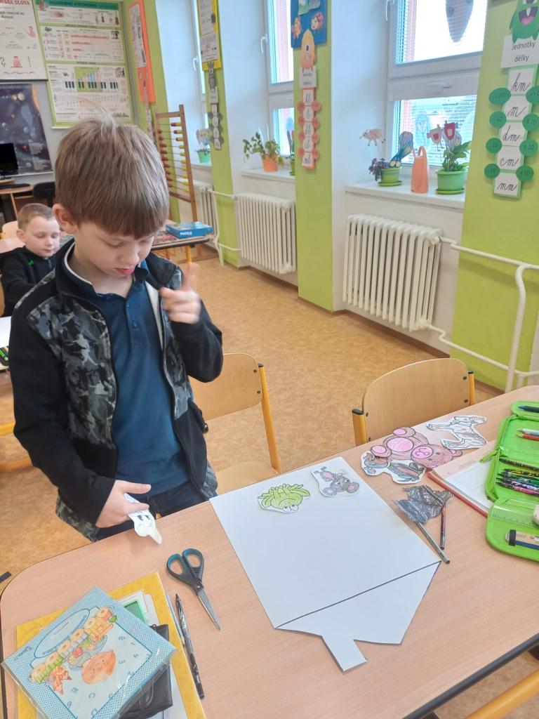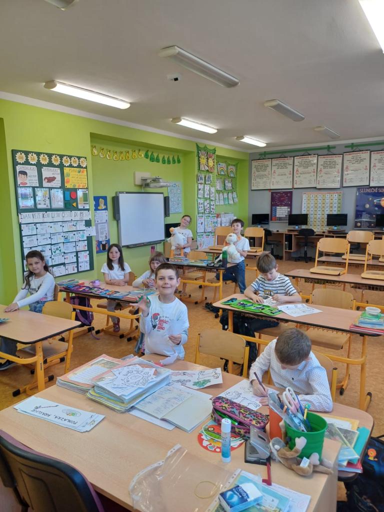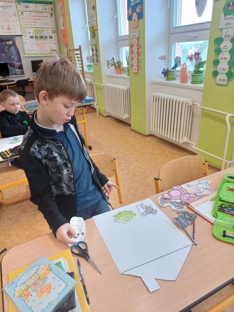Prvňáci v hodinách čtení skládali osnovu příběhu, tvořili svoje oblíbené jídlo z papíru a pohádku O budce, také luštili velikonoční úkoly a vyzdobili velikonoční přání.
