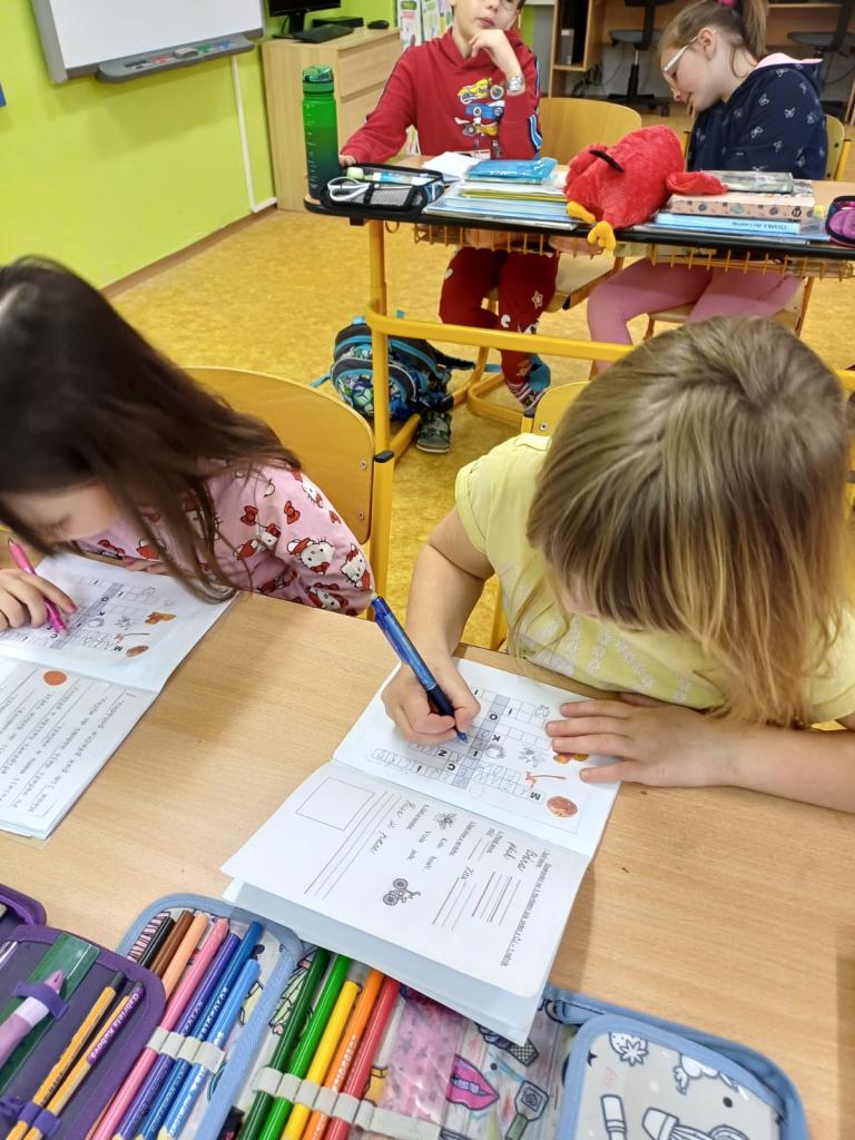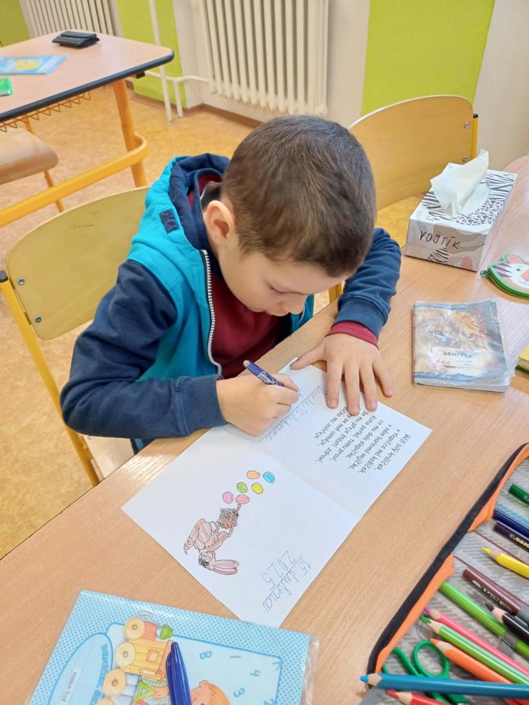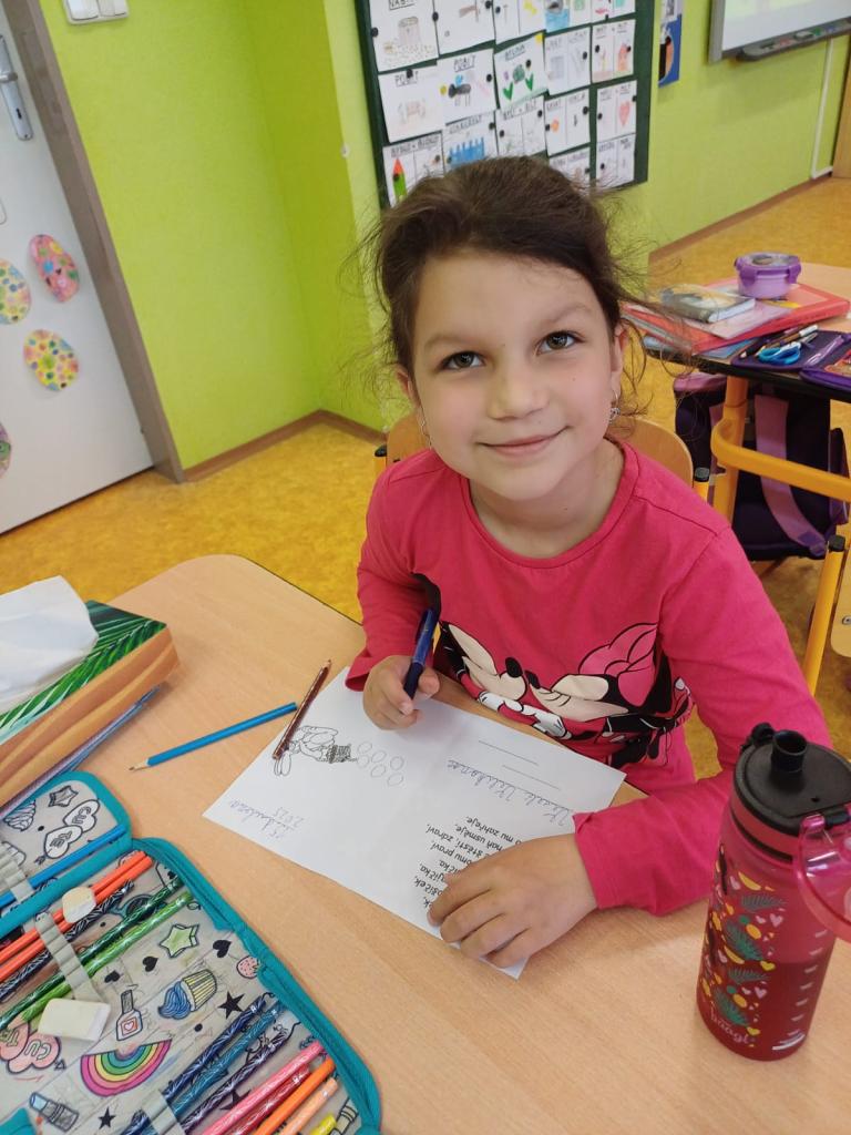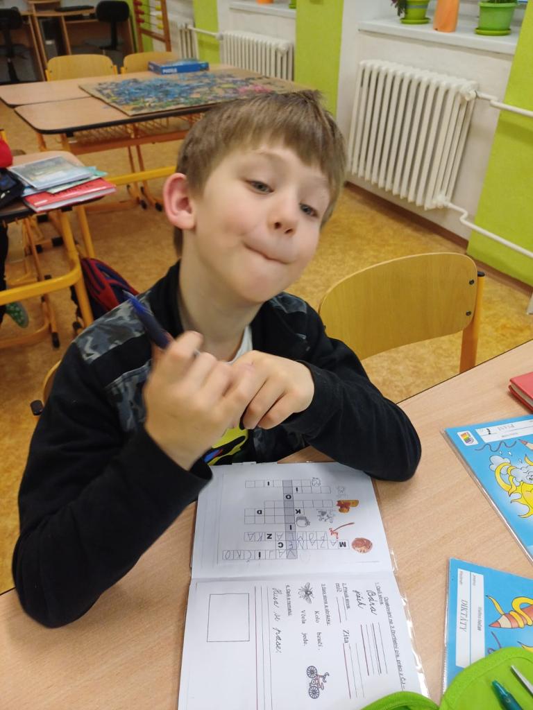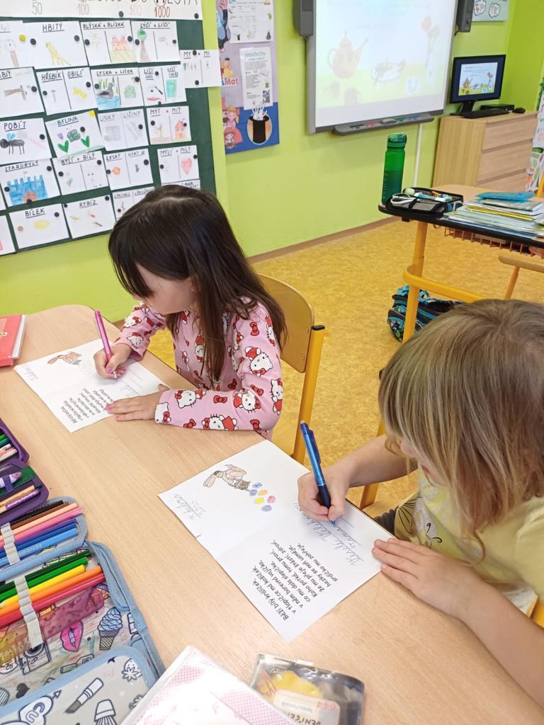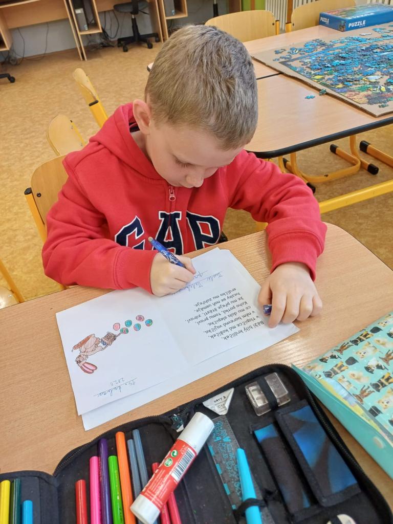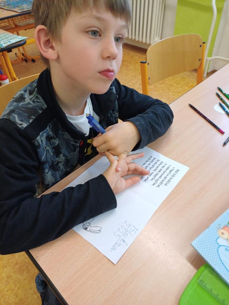 Prvňáci v hodinách čtení skládali osnovu příběhu, tvořili svoje oblíbené jídlo z papíru a pohádku O budce, také luštili velikonoční úkoly a vyzdobili velikonoční přání.