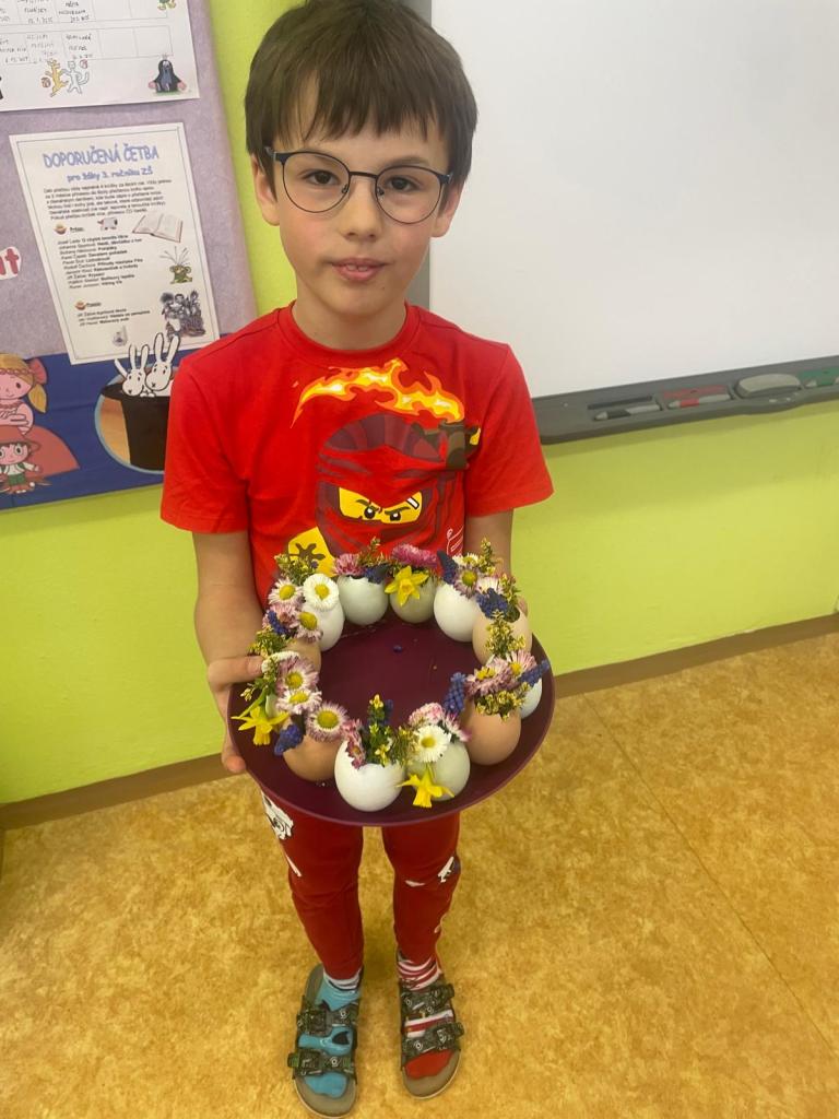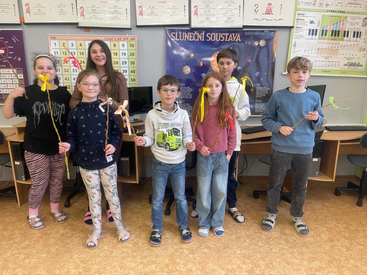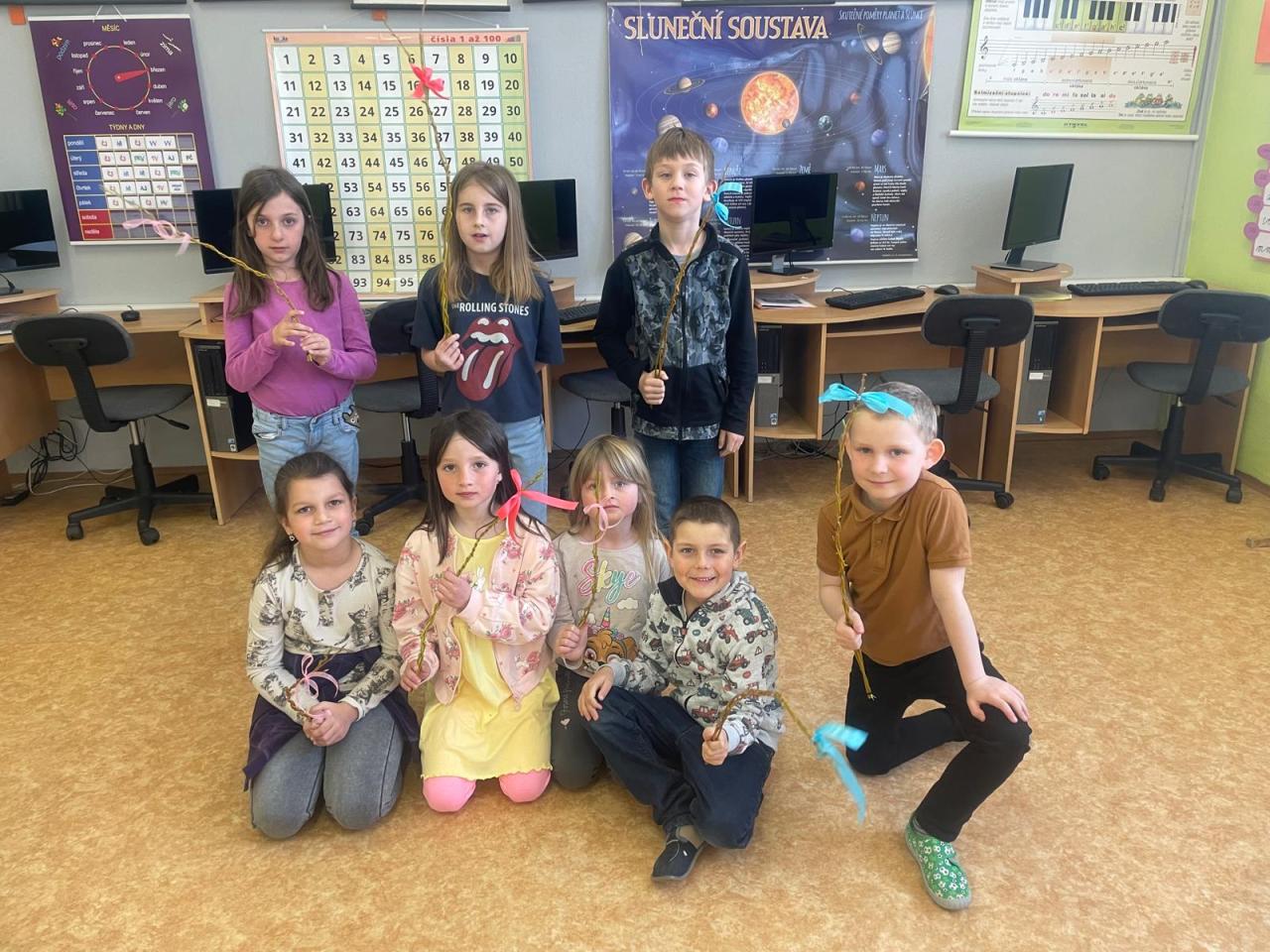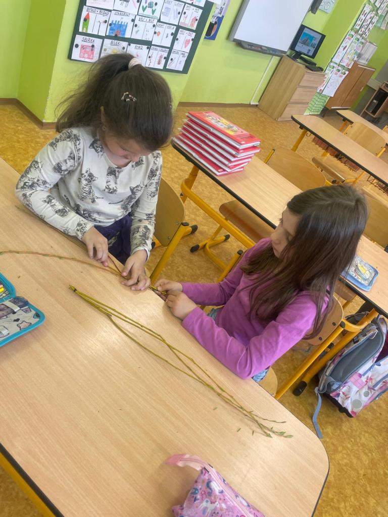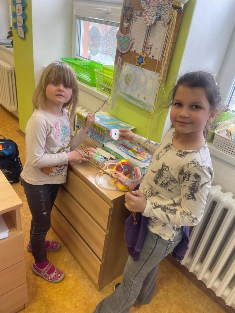 V hodinách pracovních činností a výtvarné výchovy děti vytvořily krásnou velikonoční výzdobu na stromy před školou. Také pracovaly na společném velikonočním věnečku z přírodnin.