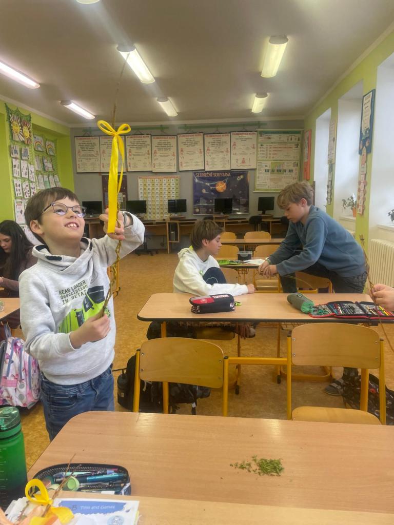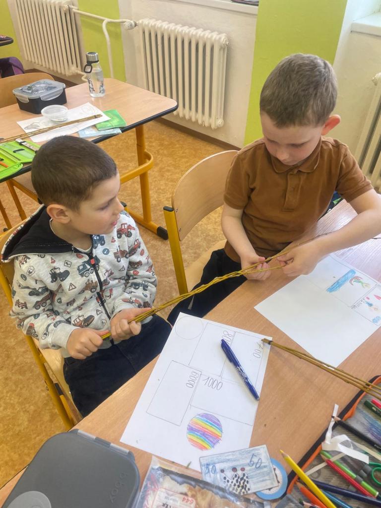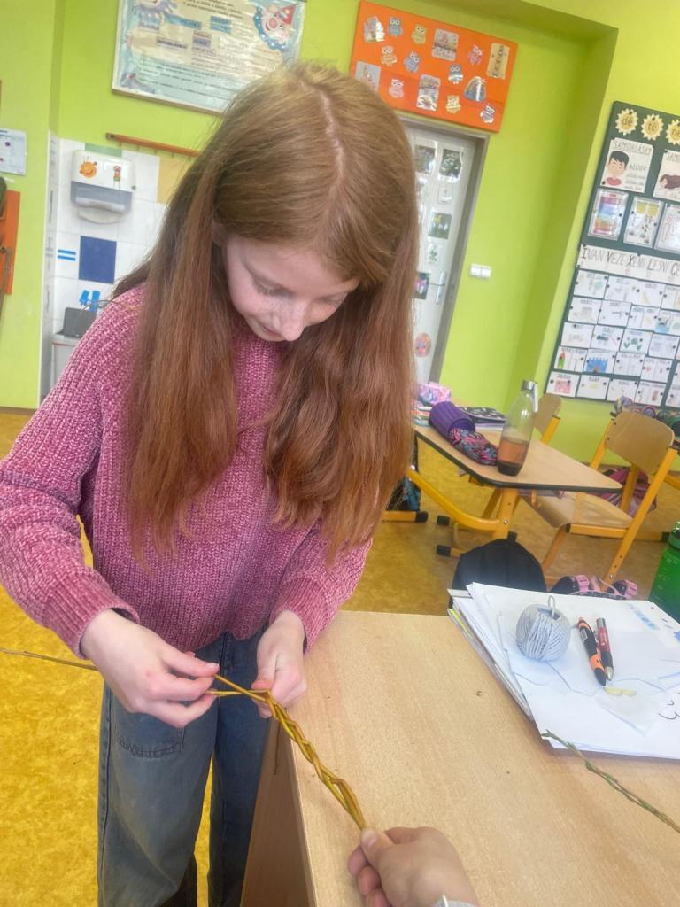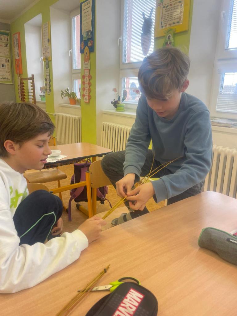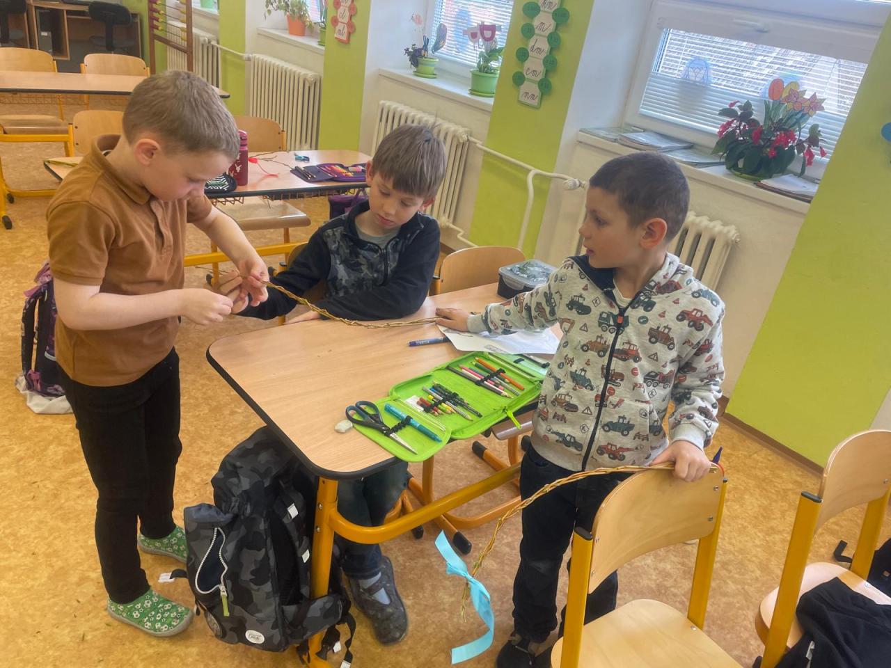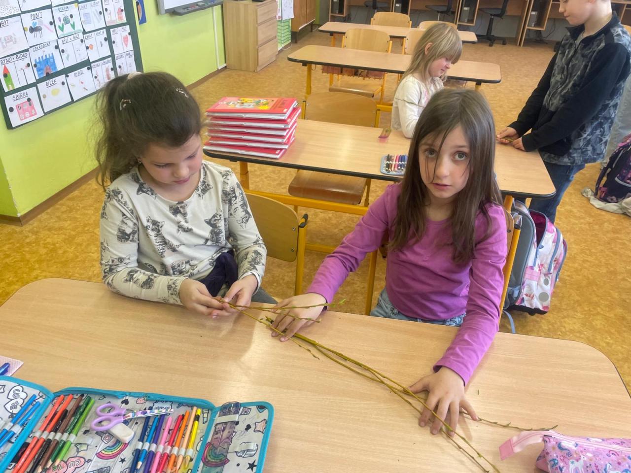 V hodinách pracovních činností a výtvarné výchovy děti vytvořily krásnou velikonoční výzdobu na stromy před školou. Také pracovaly na společném velikonočním věnečku z přírodnin.